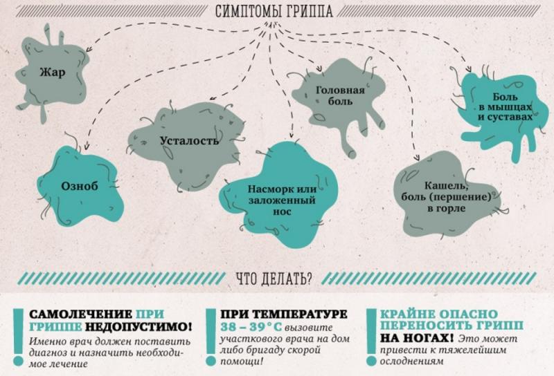 Среди симптомов гриппа — жар, температура 37,5–39 °С, головная боль, боль в мышцах, суставах, озноб, усталость, кашель, насморк или заложенный нос, боль и першение в горле.