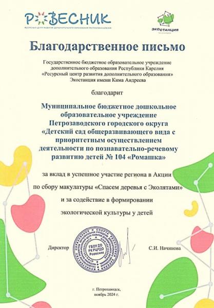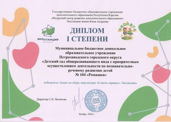 Мы уже писали о том, что наш сад стал победителем и занял 1 место в РК по сбору макулатуры «Спасем деревья с Эколятами». Сегодня в подтверждении этого нам вручили Диплом 1 степени и Благодарственное письмо .