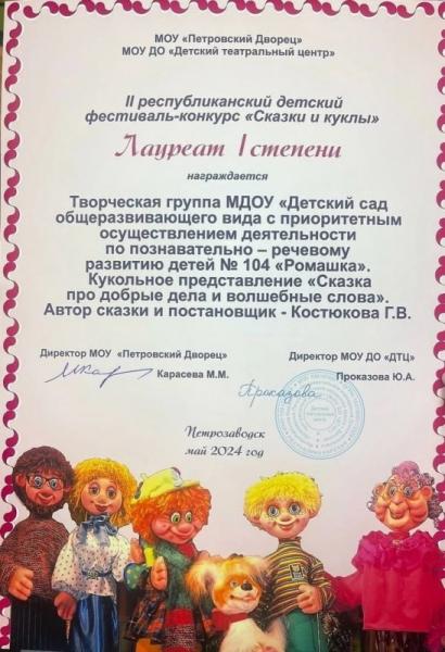Педагоги и дети МДОУ «Детский сад 104» поучаствовали в республиканском детском фестивале-конкурсе «Сказки и куклы» с кукольным представлением «Сказка про добрые дела и волшебные слова» и стали лауреатами I степени. Автором сказки и режиссером-постановщиком является наш старший воспитатель Костюкова Галина Владимировна. Поздравляем всех актеров с результатом и желаем дальнейших побед!