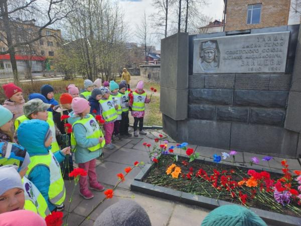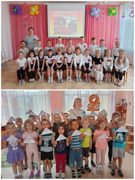 Малыши гр. "Солнышко" рисовали праздничный салют; детки из гр. "Теремок" сделали коллективную работу "Вечный огонь"; ребята гр. "Сказка" изготовили открытки с символом Победы - красной гвоздикой; дети гр. "Капелька" создавали рисунки на тему "Самолёты летят сквозь облака". У воспитанников средней, старшей и подготовительной групп прошли тематические музыкальные занятия, на которых пели песни, читали стихи, слушали музыку военного времени. Во время прогулки дети старшей и подготовительной групп совершили экскурсию и возлагали цветы к памятникам героев войны Василия Зайцева и Марии Мелентьевой.